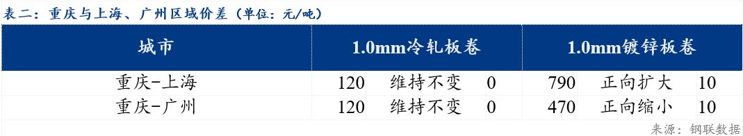 重庆、上海地区冷轧板卷区域价差维持不变 ;重庆、广州冷轧板卷区域价差维持不变 。重庆、上海镀锌板卷区域价差扩大10元/吨;重庆、广州镀锌板卷区域价差缩小10元/吨。镀锌、冷轧品种价差扩大10元/吨;镀锌、热轧品种价差扩大30元/吨 ;冷轧、热轧品种价差扩大20元/吨 。