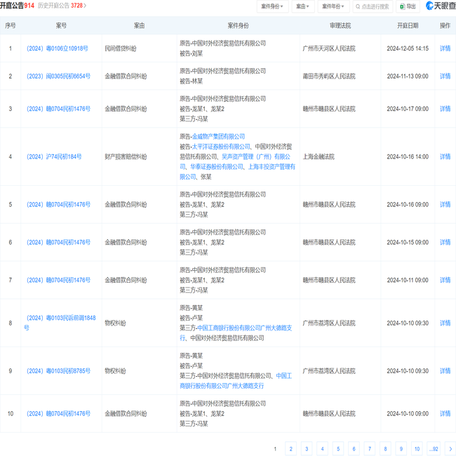 据天眼查法律诉讼信息显示,中国对外经济贸易信托有限公司(以下简称“外贸信托”)因案外人执行异议之诉被告,于2024年8月19日在沭阳县人民法院开庭审理【案号:(2024)苏1322民初7356号】。