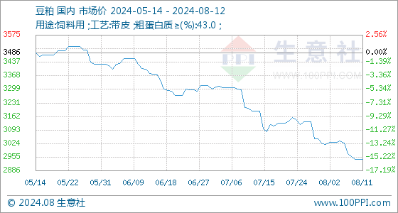 8月12日,生意社豆粕基准价为2944.00元/吨,与本月初(3022.00元/吨)相比,下降了-2.58%。