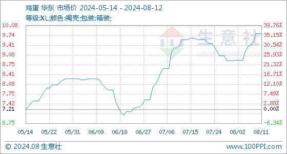 8月12日,生意社鸡蛋基准价为9.80元/公斤,与本月初(8.88元/公斤)相比,上涨了10.36%。