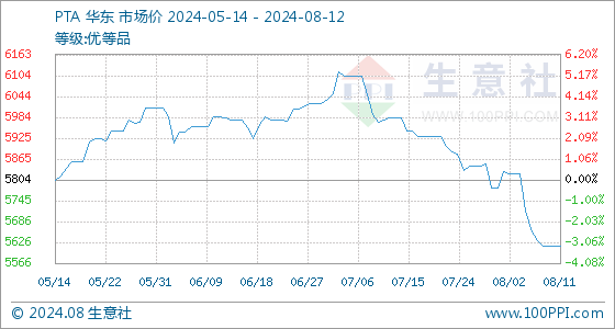 8月12日,生意社PTA基准价为5616.67元/吨,与本月初(5781.11元/吨)相比,下降了-2.84%。