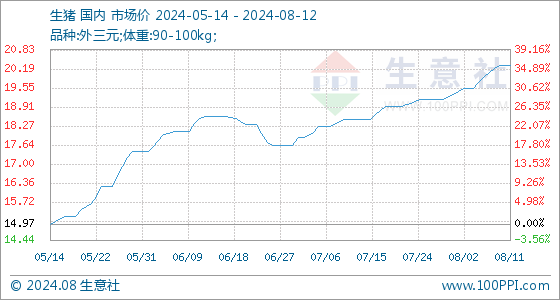 8月12日,生意社生猪基准价为20.30元/公斤,与本月初(19.33元/公斤)相比,上涨了5.02%。