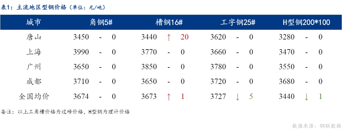 从区域价差来看,唐山与上海、广州、成都角钢、工字钢、H型钢价差维持不变。