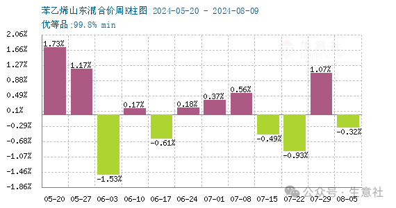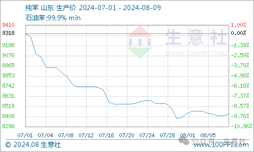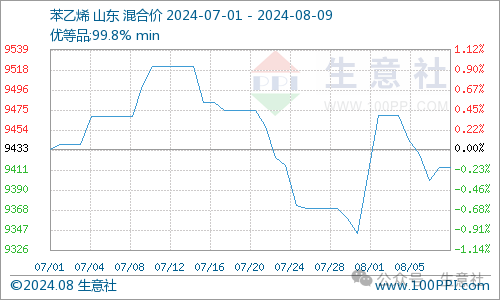 据生意社商品行情分析系统,近期苯乙烯行情震荡。8月1日山东苯乙烯价格在9404元/吨,8月9日价格在9414元/吨,涨幅为0.11%。