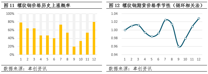 【螺纹钢】螺纹钢的下游集中在房地产上,最适宜开工的时间阶段是3-5月和9-11月,这一阶段消费达到一年内高点。但从价格角度看,螺纹钢最容易上涨的阶段在消费旺季之前而非之后。我们理解,这样工程施工原材料进场时间有关,提前备货的行为导致价格先行,一年中12-次年3月,7月上涨概率超过60%,而从价格水平上看,7-8月,11月至次年2月是价格季节性偏强的阶段。