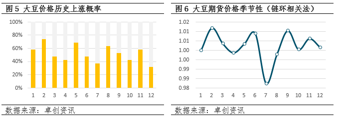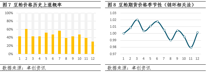【大豆】大豆的生产主要集中在南北美洲,统计2002年以来的期货价格数据,一年之中2月、5月、8月上涨概率超过60%,7月、12月两个月下跌概率较高。南半球大豆的收获季集中在3月中旬到6月中旬,北半球的收获期集中在9月中旬至11月中旬,2月处于南半球大豆的开花期,5月是南半球大豆集中上市期,均有来自供应端的变动带来的影响,12月份处于全球大豆生产的空白期,需求在这一阶段也相对较弱,对价格形成抑制作用。7月随着南美大豆会集中到港,对价格形成压力,7-8月价格一般处于年内较低水平。