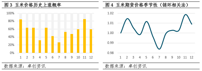 【玉米】国内玉米收获季主要集中在7-8月份,统计2004年以来玉米期货价格数据看,4月、6-7月和9月下跌概率均超过50%。夏季是玉米生长旺季,这是时间节点,供应预期的压力是影响季节性的重要因素,而在过去的20多年时间中,玉米产量一直处于增长状态,而需求端也因为养殖等行业发展保持增长趋势,因此在玉米收获季节之前市场一般面临着“丰产预期”也因此造成价格在6-7月份下跌,而事实的丰产也在随后的9月份对价格产生抑制作用。从价格的季节性规律看,4月、6-7月易跌难涨,其中7月份为一年内相对最低水平,我们理解供应压力是造成价格6-7月环比下跌的主要因素。