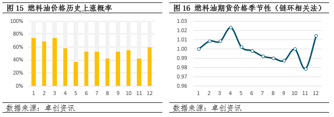 【燃料油】燃料油是原油炼化之后的产物,主要用做电厂发电、船舶锅炉燃料、加热炉燃料、冶金炉和其它工业炉燃料。从历史月均价的涨跌情况统计看,一年之中1-2月份上涨概率均超过60%,5月、8月、11月三个月下跌概率超过50%。从价格的季节性指数家督看,一年之中12月至来年3月价格易涨难跌,6月-11月易跌难涨。