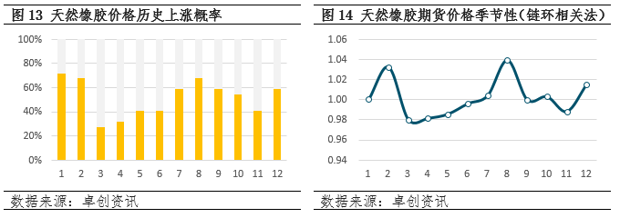 【橡胶】类似螺纹钢的季节性特点,橡胶的季节性与螺纹钢类似。天然橡胶具有农产品生产的属性,但终端以轮胎消费为主,兼具农产品和工业品的两种属性。从历史涨跌轻卡滚看,1-2月和8月在一年中上涨概率超过60%从需求端来看,轮胎企业生产开工都具有明显的季节性,春节前后会有放假,进而导致需求降入冰点,但企业囤货补库存的行为会对价格产生明显的影响,春节前的两个月还有冬储的需求,而7-8月份则存在补库存的需要,这两个阶段价格相对较为容易出现季节性上涨行情。