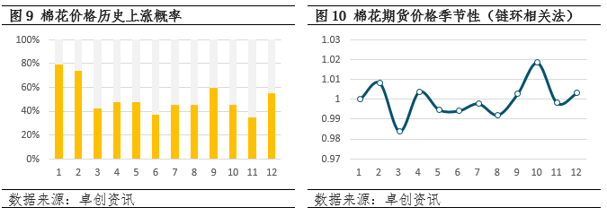 【棉花】国内棉花主要集中于新疆产区,棉花从播种到收获大概需要半年时间,一般播种期在4月中旬,收获期在10月份。统计棉花期货自2004年上市以来的数据看,1-2月两个月份上涨概率超过70%,9月和12月两个月份上涨概率超过50%。1月份是上涨概率较大的一个月份,但从涨幅上来看,10月份涨幅最大。从历史季节性分析,全年仅有2月、4月、9月、12月价格是环比上涨的。