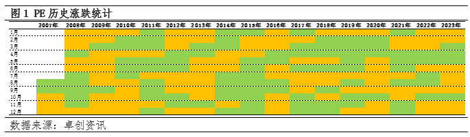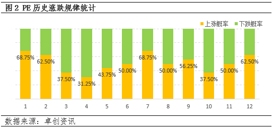 影响价格季节性涨跌的因素与商品自身特点有关。以农产品为例,农业生产受气候田间限制,大部分的农作物都需要在特定的季节播种和收获,这就导致农产品具有明显的朴素的季节性特点——青黄不接且需求大的时候涨,收获的季节容易跌。但在期货价格上,价格的季节性特点往往表现的并不一致,这与期货“预期”交易有关,价格更容易受到情绪的影响。以图2为例,反映的就是PE历史价格的涨跌规律。从图1可以看出,1-2月、7月和12月四个月上涨概率超过60%。