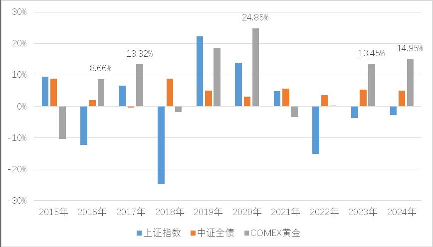 随着“资产荒”再现,投资者需要进一步丰富自己的投资组合收益来源,以增强组合的韧性。而黄金属于商品资产,其行情周期、风险收益特征与股票、债券存在明显差异,这也就能够与这两类资产形成优势互补。