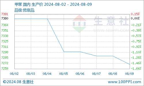 据生意社商品行情分析系统显示,近日(8.2-8.9)甲苯市场整体下行。8月5日甲苯基准价在7380元/吨,8月9日甲苯基准价在7270元/吨,周期内下跌1.49%。本周期甲苯市场接续保持偏弱运行,市场价格震荡下行。周内原油价格走低,拖累市场心态,市场气氛整体偏空。需求方面整体偏弱,汽油混调行业采购积极性较低,下游入市积极性较低,叠加宏观面走弱,使得市场看空气氛较浓,截止8月9日华东地区主流报价区间在7220-7250元/吨,较上周价格累计下调70-100元/吨。
