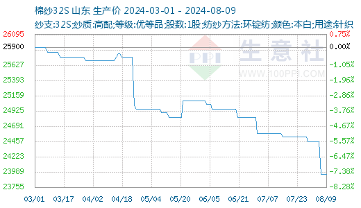 据生意社商品行情分析系统显示:本周(8.3-8.9)棉纱价格小幅下跌。截止2024年8月9国内山东地区21S纯棉纱市场参考价格在22900元/吨,与上周价格持平;32S纯棉纱市场参考价格在23950元/吨,较上周价格下跌500元/吨,跌幅2.04%