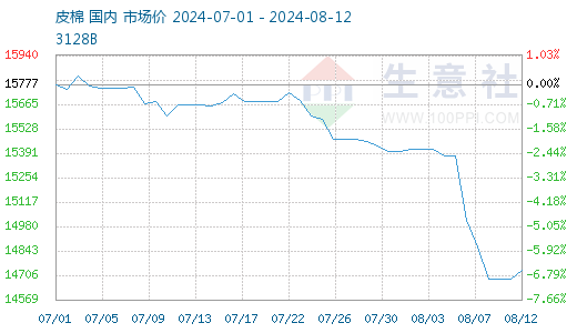 8月上旬,棉花整体供应宽松,目前棉花内外价差较大,内棉无优势压力较大,棉价跌势扩大。据生意社商品行情分析系统,8月12日3128B级皮棉现货价格在14733元/吨,较月初下跌4.32%。