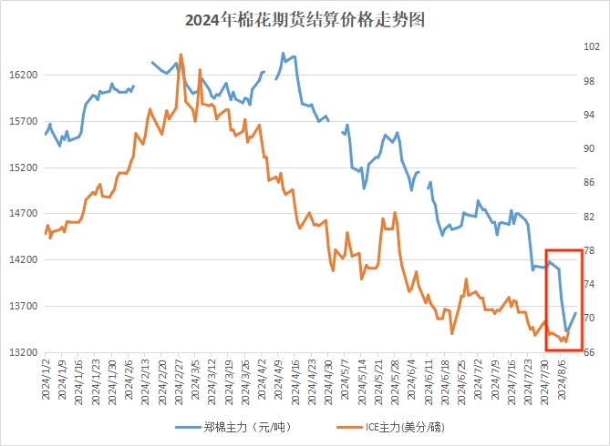 国际市场:上周美股大跌,商品市场承压,美棉下挫加大,之后随着美股、国际原油价格反弹,市场参与者心态有所改善,上周五在外围市场情绪转好的影响下,棉花出现超跌反弹表现。7月下旬美棉合同大量被取消,美棉出口连续两周大幅下滑,市场分析是受到海运费大幅上涨、2024年中国只增发20万吨滑准关税棉花进口配额以及巴西棉的竞争压力。