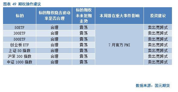 一季度经济修复超预期后,二季度经济表现整体是弱于市场预期的。主要体现在三个方面;一是消费数据偏弱,尤其是可选消费较为低迷。二是房地产修复不及预期,虽然销量有所回升,但是成交价并没有明显改善。三是通胀仍然偏低,供大于求的现象并没有明显好转。这三个现象同时反映了当前社会预期偏弱,居民投资以及消费端皆偏保守。股指7月整体呈现震荡下行走势,且成交额降至低位。短期来看,目前市场缺乏上行动力,投资者预期短期大幅改善可能性较低,预期以震荡行情为主。中长期来看,虽然宏观经济以及个股业绩弱复苏的情形今年恐难大幅改善,但目前股指估值偏低,且利率环境较为友好,今年仍有小幅反弹机会。股指期货方面,建议投资者空仓观望。目前套利机会较小,建议投资者继续等待机会。期权方面,建议投资者继续持有宽跨式卖出策略。