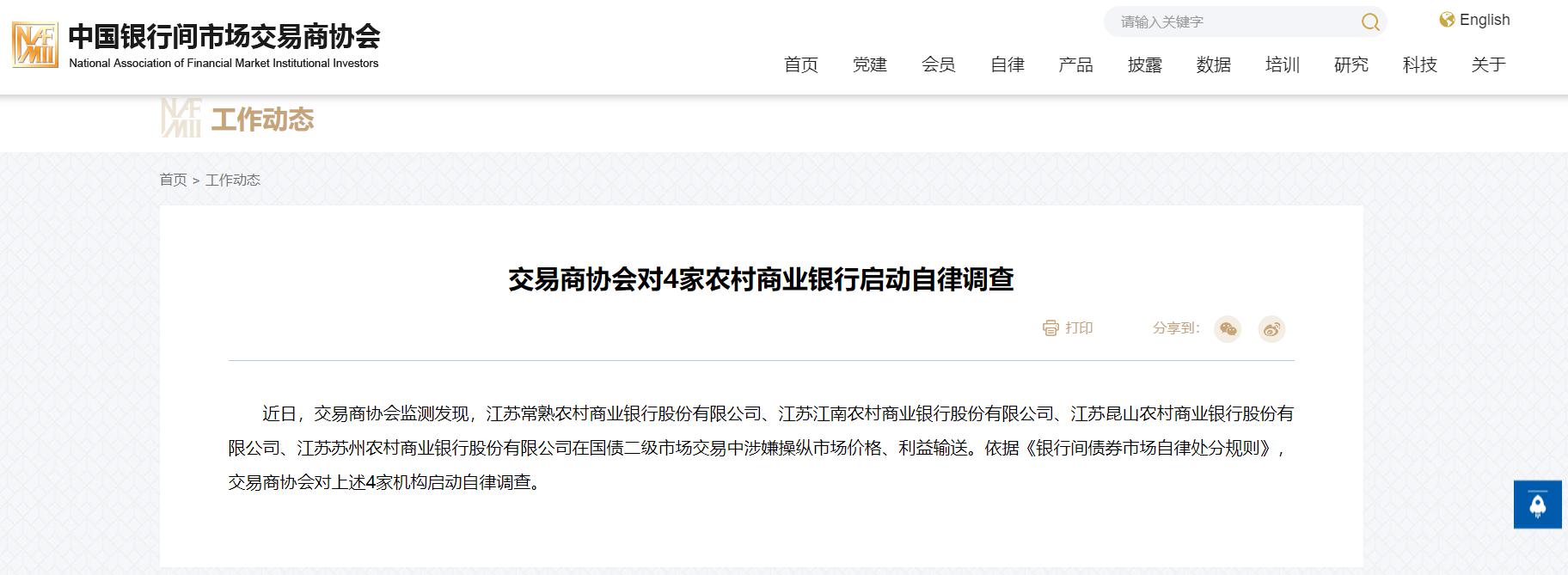 近日,交易商协会监测发现,江苏常熟农村商业银行股份有限公司、江苏江南农村商业银行股份有限公司、江苏昆山农村商业银行股份有限公司、江苏苏州农村商业银行股份有限公司在国债二级市场交易中涉嫌操纵市场价格、利益输送。依据《银行间债券市场自律处分规则》,交易商协会对上述4家机构启动自律调查。