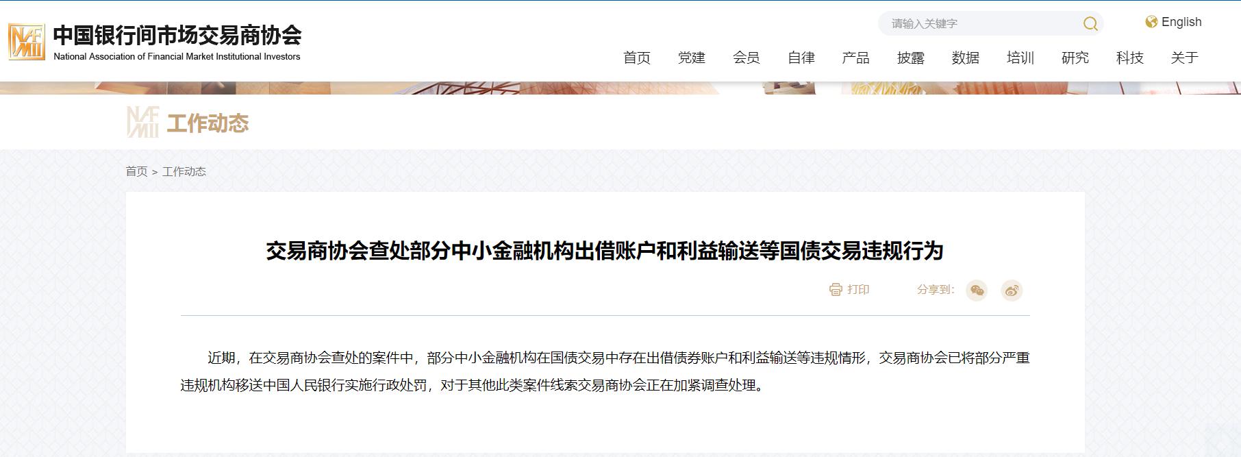 今日,交易商协会再发文称,近期,在交易商协会查处的案件中,部分中小金融机构在国债交易中存在出借债券账户和利益输送等违规情形,交易商协会已将部分严重违规机构移送中国人民银行实施行政处罚,对于其他此类案件线索交易商协会正在加紧调查处理。