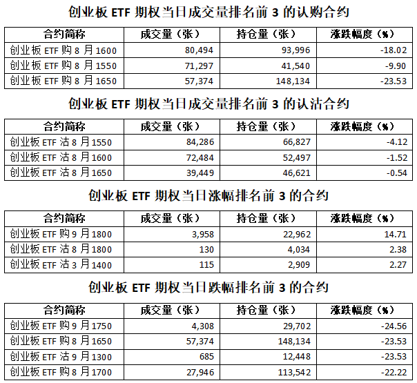 创业板ETF期权总成交面额102.33亿元,减少7.63%,期现成交比为0.33,权利金成交额2.11亿元;期权总成交量642,242张,减少6.75%,其中认购期权成交量331,795张,认沽期权成交量310,447张,认沽认购成交比率为0.94(上一交易日认沽认购成交比率为0.91)。