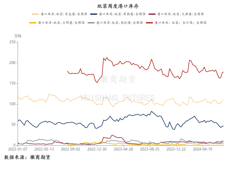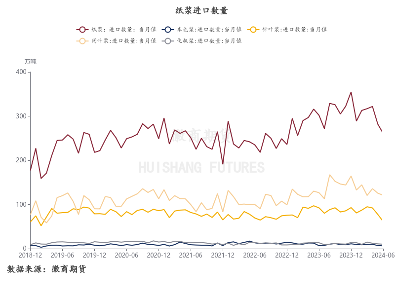 据海关总署公布的数据显示,中国2024年6月纸浆进口量为260.7万吨,环比-7.6%,同比-13.7%,全年累计进口量1783.2万吨,累计同比+1.6%。其中,漂白阔叶浆进口数量120.6万吨,环比-3.9%,同比-4.8%,全年累计进口量778.6万吨,累计同比+3.9%;漂白针叶浆进口数量55.0万吨,环比-21.9%,同比-35.8%。全年累计进口量442.8万吨,累计同比-2.7%。受海外浆一季度末和二季度初因不可抗力因素所导致的供应缩减,纸浆进口量缩减明显,其中作为交割品的漂针浆更为明显。但7月国外发运减少情况逐渐缓解,纸浆进口量逐步恢复,主要纸浆港口到港量逐步恢复为正常数量。但下游接单能力不足,预计7月进口量虽环比增加但同比仍会减少。