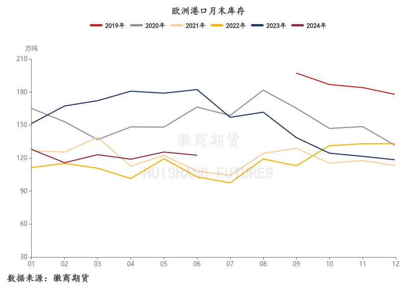 今年以来,海外经济呈现出复苏态势,下游原纸厂家进入补库周期,对原材料的需求更为强劲,2024年6月Utipulp欧洲纸浆消费量86万吨,环比+1%,同比+15%。在消费量增加的同时,也预示着库存量的降低,据Europulp数据显示,2024年6月份欧洲港口纸浆月末库存量环比-2.3%,同比-32.8%,库存总量由5月末的125.5万吨下降至122.6至万吨。从消费量和库存量来看,2024年相较于2023年出现了较大幅度的消费增加和库存去库,整体上海外需求端对于纸浆价格的支撑仍然存在。