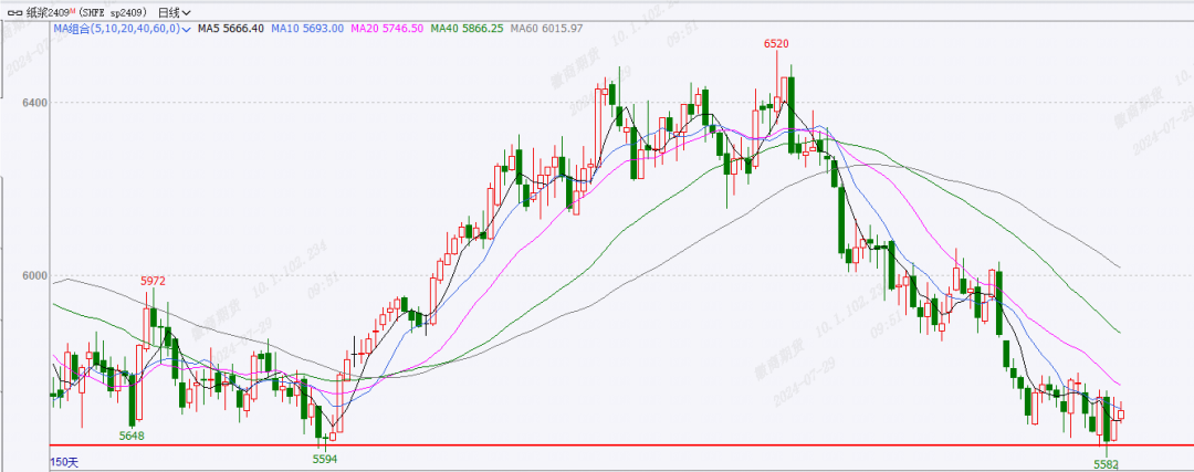从纸浆2409合约的历史行情来看,2024年上半年,得益于供应端的利多支撑以及宏观情绪的推动,纸浆期货价格走出了强势上行,但随着供应利多被市场逐步消化,需求不足的拖累和供应增加的预期渐渐被交易者所重视,浆价籍此震荡下行。进入七月,纸浆价格延续偏弱走势,但在经历一波较为剧烈的下行后价格步入春节前的震荡区间,在此浆价获得较强的支撑,进而区间震荡运行至今。