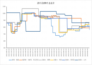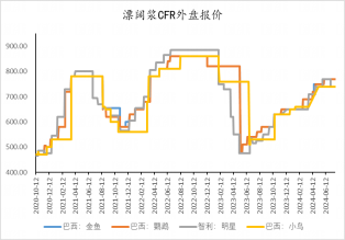 外盘报价作为国内纸浆价格的重要参考对象,自2024年3月至6月,得益于纸浆供应端的利好纸浆外盘报价不断上涨,月均上涨在30-50美元/吨。但据隆众资讯报道,智利Arauco公司公布7月份木浆外盘:针叶浆银星765美元/吨,下降55美元/吨;阔叶浆明星暂不报盘;本色浆金星持稳于690美元/吨。近期纸浆最新的外盘报价受到需求不足的拖累,在前期平盘的基础上,出现了下调,让纸浆一直以来坚挺的价格支撑出现了松动。