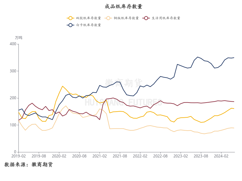 自22年始,我国造纸行业中的玖龙纸业、太阳纸业、仙鹤股份、五洲特纸等纸企均投出百亿规模项目,将扩产潮推向顶峰。这轮扩产潮预计涉及新增产能达780万吨。其中2024年至少有500万吨造纸产能建成。但是,前述产能数据均为项目规划产能,考虑到造纸项目投产后一般需要2年左右达产,前述500万吨产能并不能在今年完全落地。后续来看,海外需求基本维持稳定,国内后续逐步进入需求旺季,纸浆需求有望有所改善。