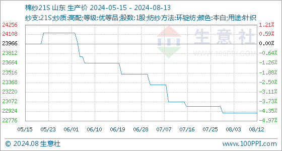 8月13日,生意社棉纱21S基准价为22900.00元/吨,与本月初持平。