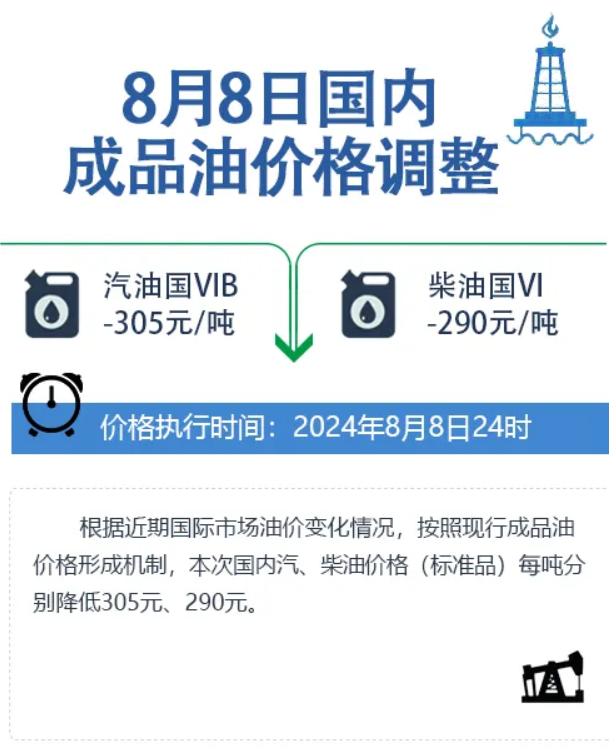 IT之家 8 月 8 日消息,国家发展改革委今日公告,本轮成品油调价周期内(7 月 25 日— 8 月 7 日)国际油价下降。8 月 8 日 24 时起,国内汽、柴油价格每吨分别下调 305、290 元。