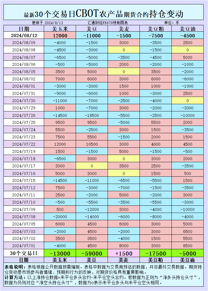 增加CBOT玉米投机性净多头;增加CBOT大豆投机性净空头;增加CBOT小麦投机性净空头;增加CBOT豆粕投机性净空头;增加CBOT豆油投机性净空头。