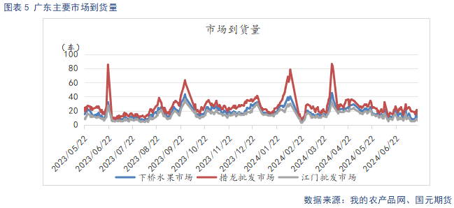 截止7月19日,洛川70#半商品均价4.1元/斤,价格与上周环比持平。栖霞80#一二级均价3.2元/斤,价格与上周环比上涨0.2元/斤。据果品流通协会统计,截止2024年7月19日,全国富士批发均价8.01元/公斤,较上周环比持平。截止7月19日,广东主要苹果批发市场日均到货11车,较上周日均到车量基本持平。果季后期,库存果剩余不多,水果市场以夏季时令果为主,苹果以质论价,偏差货源走货缓慢,价格低位震荡,好货供给偏紧,价格片奇怪,整体走货一般,价格相对稳定,到车量维持低位。