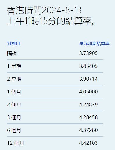 8月13日,港元拆息见短息升、中长期利率下跌,其中,隔夜息升近6基点至3.73905%,而与楼按相关的一个月拆息亦回落至4.05%。