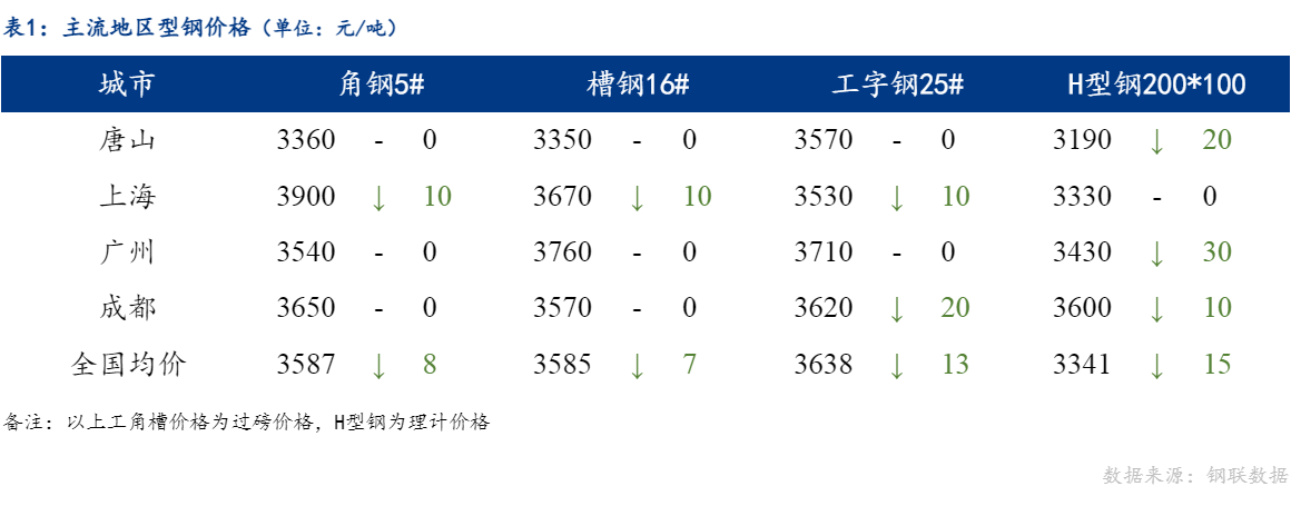 今日期螺持绿下行,现货市场悲观情绪增加,整体交投氛围清淡。目前钢厂检修计划增加,但下游需求疲软情况无任何改善,厂库社库依旧高位,去库压力大。钢坯价格大幅下调,对成品材底部支撑略显欠缺。综合来看,预计明日全国型钢价格趋弱调整。