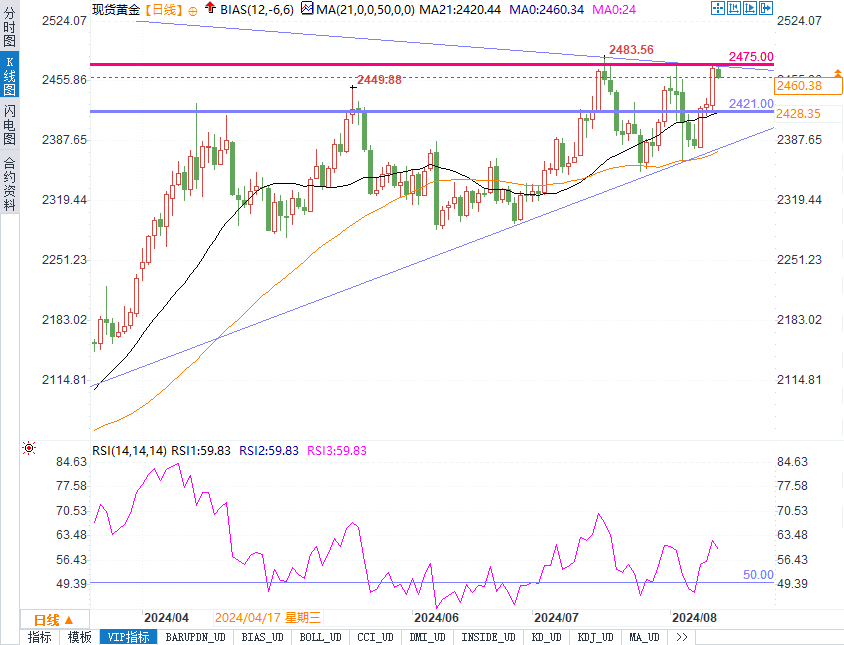 Mehta建议,若金价能够突破当前的对称三角形阻力位(2475美元/盎司),则有可能进一步升至历史高位2484美元/盎司,进而测试2500美元/盎司大关。