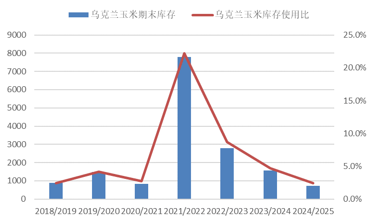 24/25年度,巴西、阿根廷新作玉米平衡表均维持较上月不变。俄罗斯玉米产量继续下调,从1500万吨下调至1410万吨,下调90万吨;国内饲用需求调降50万吨,出口调降40万吨,期末库存不变。乌克兰新作产量从2770万吨下调至2720万吨,出口相应下调50万吨(按照上年3250万吨的产量,今年新作产量降幅16.3%,主要因高温干旱)。全球新作玉米库存从3.12亿吨下调至3.1亿吨。市场平均预估3.1亿吨。