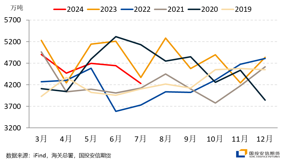 今年7月中国原油进口量为4233.7万吨,环比降9%,同比降3%,为去年以来最低值。与2019年之前中国原油进口量逐年攀升的趋势有所不同,近5年来受疫情扰动、替代燃料汽车渗透率提升等因素影响,中国原油进口量的趋势性大幅放缓。今年以来,成品油消费在经济周期与能源结构转换周期的双重压力下表现平淡,炼厂利润承压,5月以来原油进口量同比持续为负,施压全球需求预期,对油价形成阶段性利空效应。