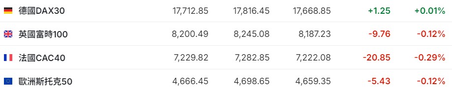 2. 截至发稿,德国DAX指数涨0.01%,英国富时100指数跌0.12%,法国CAC40指数跌0.29%,欧洲斯托克50指数跌0.12%。