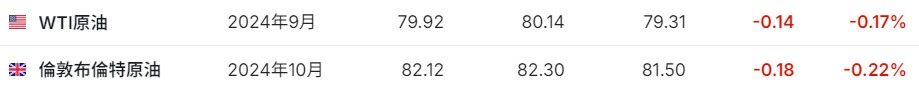 3. 截至发稿,WTI原油跌0.17%,报79.92美元/桶。布伦特原油跌0.22%,报82.12美元/桶。