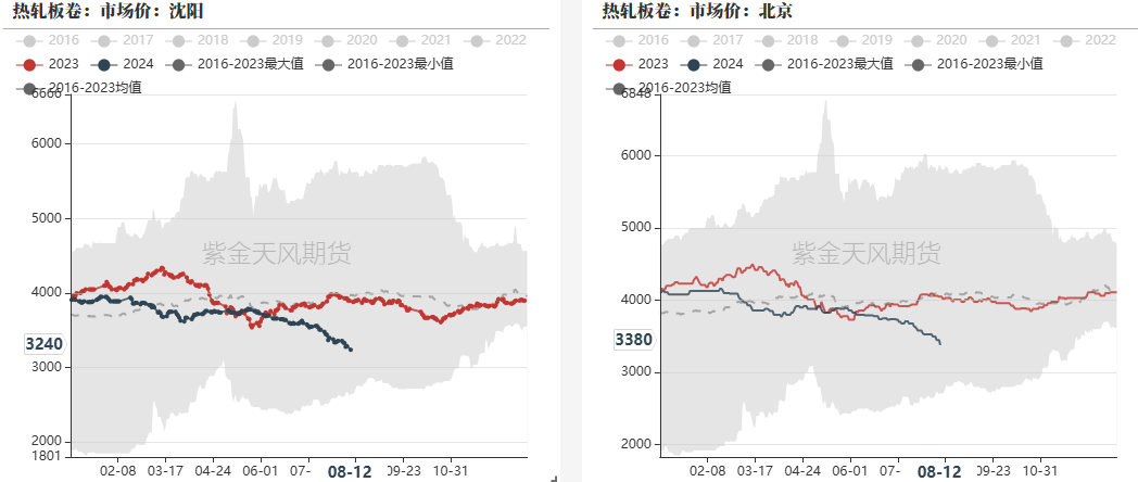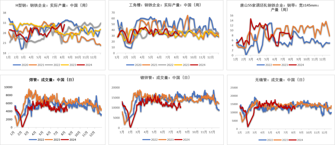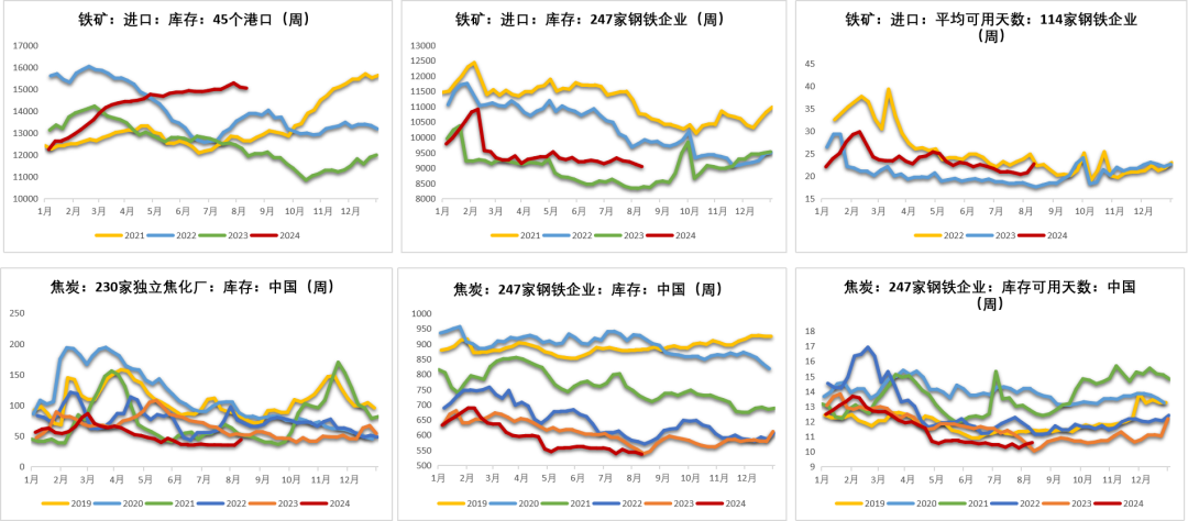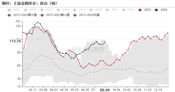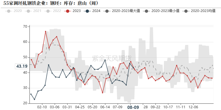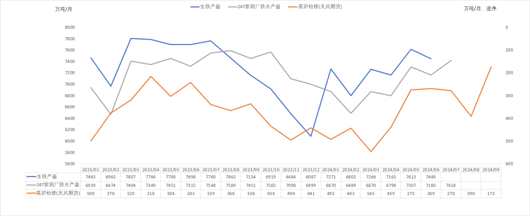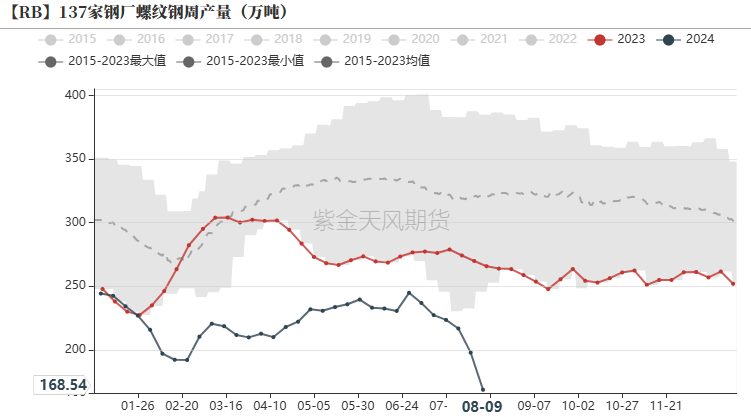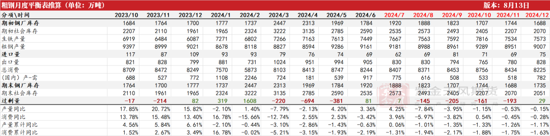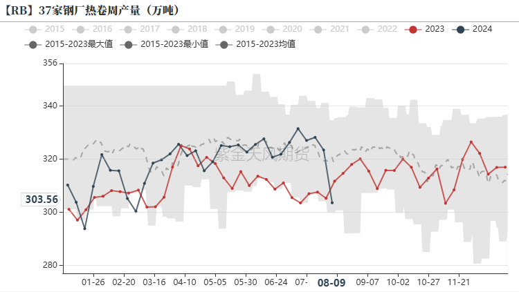 截至2024年8月9日,日均生铁产量为231.7万吨,环比下降4.92万吨(降幅2.08%);相比于去年同期下降4.9%。