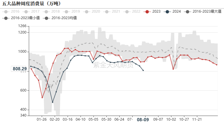 需求方面,本周五大品种消费总量达808.29万吨,环比下降46.22万吨,降幅5.4%,相比于去年同期下降10.0%。
