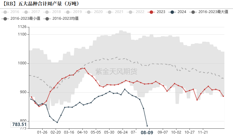 本周,五大品种合计产量为783.51万吨,环比上周下降60.55万吨(降幅7.2%),去年同期产量为929.61万吨,同比下降15.7%。
