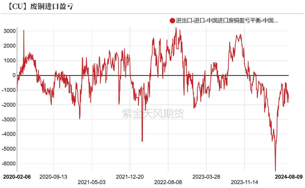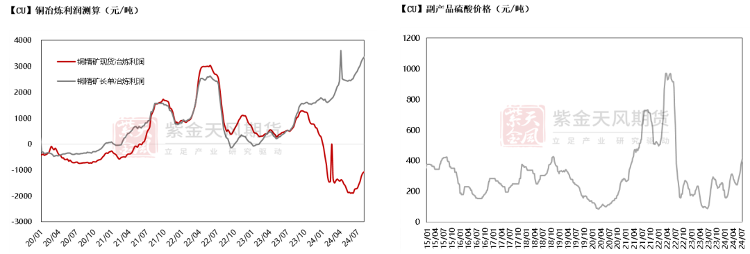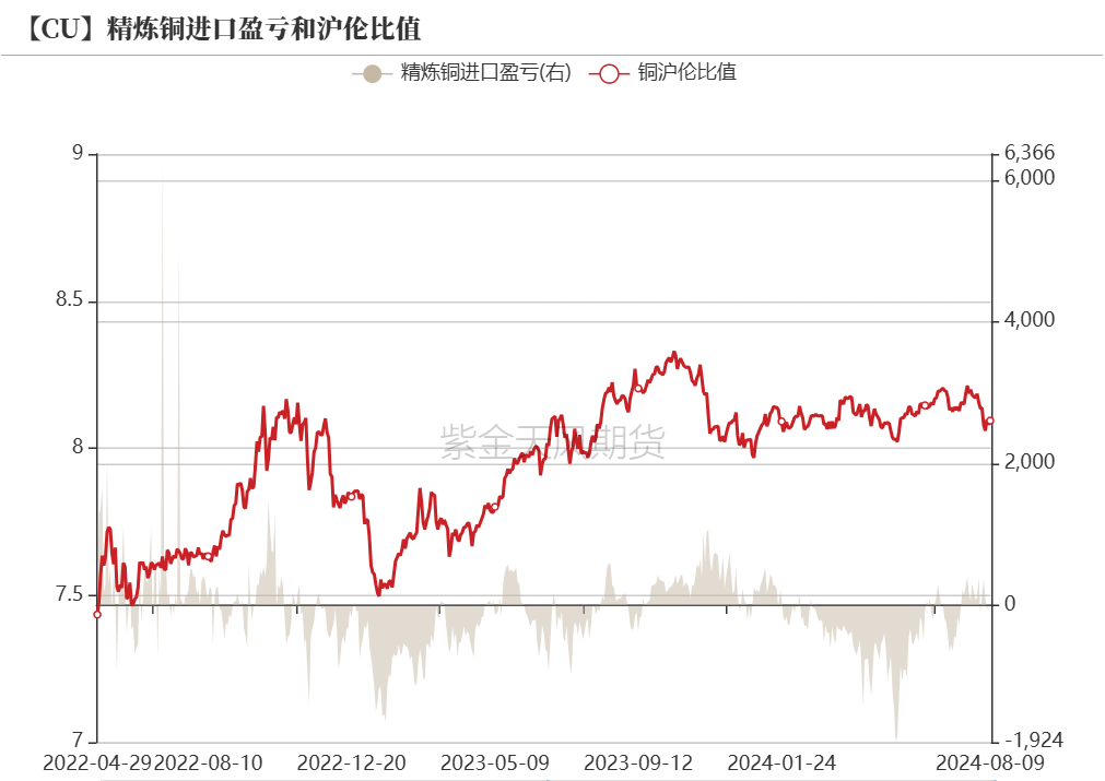 上周,TC价格小幅回落,但硫酸价格持续上涨,但铜价回落导致亏损及盈利空间维持稳定。当下,零单亏损空间维持在1000元/吨左右,长单利润空间在3400元/吨左右。从调研预期来看,国内8月电解铜产量预估较7月小幅增加,但由于铜价回落后消费表现良好,预计8月基本维持紧平衡。