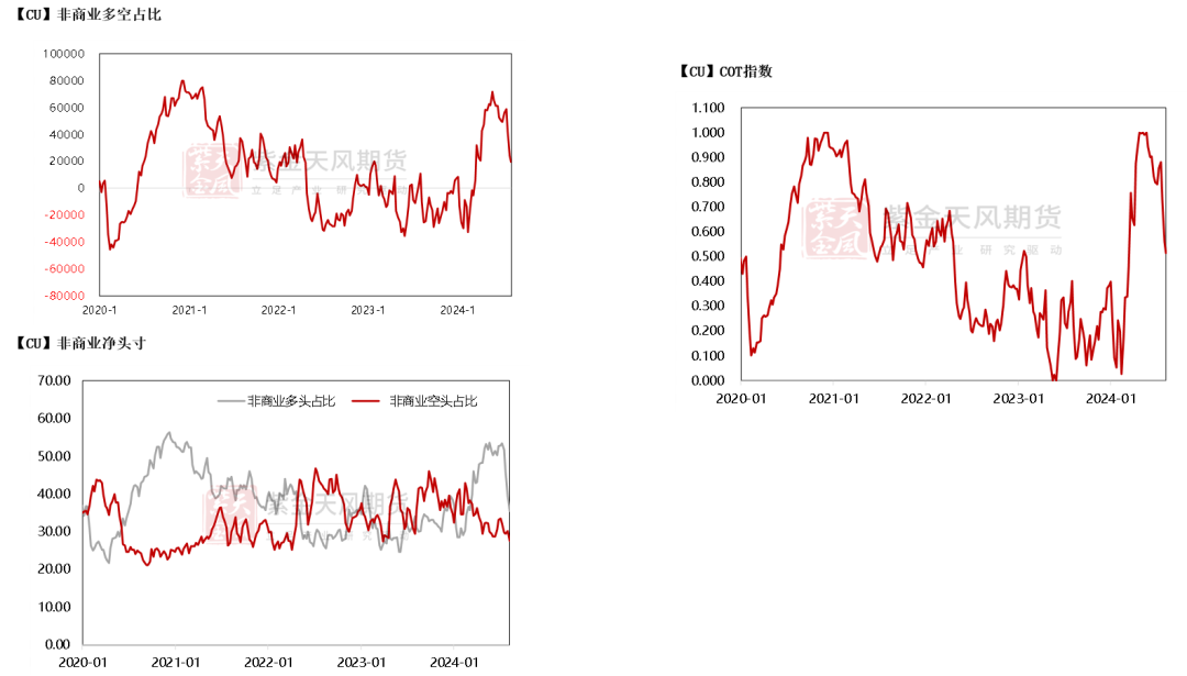 非商业净多头持仓为19598张,COT指标回到0.515,铜价强势持续减弱。
