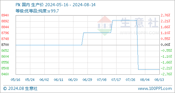 8月14日,生意社PX基准价为8500.00元/吨,与本月初持平。