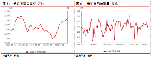 上周,全国45港铁矿石库存总量15043.96万吨,环比降46.53万吨;45港日均疏港量308.02万吨,环比增9.63万吨。全国钢厂进口铁矿石库存总量为9045.9万吨,环比降76.8万吨;当前样本钢厂的进口矿日耗为283.8万吨,环比降7.1万吨,库存消费比31.88,环比增0.52天。