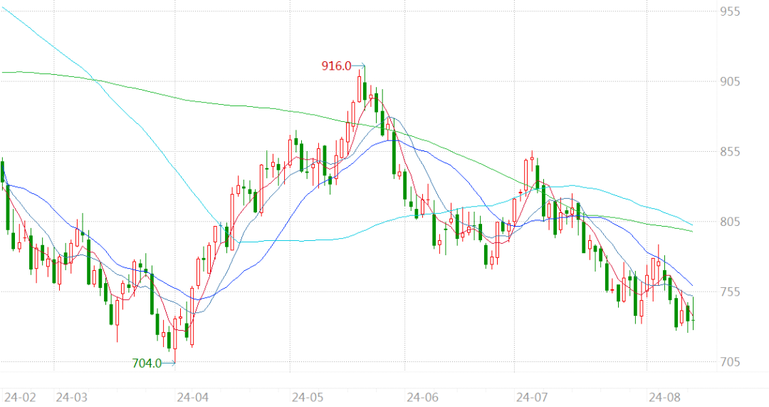 8月5日-8月12日,铁矿2501合约震荡偏弱运行,12日收于734元/吨,周跌5.8%。