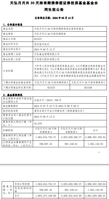 天弘月月兴30天持有期债券成立募集金额49亿元