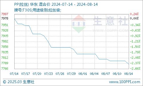 据生意社商品行情分析系统显示,八月前半PP市场行情延续弱势整理行情,各牌号产品价窄幅下跌。截止8月15日下午,国内生产商、贸易商拉丝主流报盘价格在7785.71元/吨左右,较月初涨跌幅-0.55%。